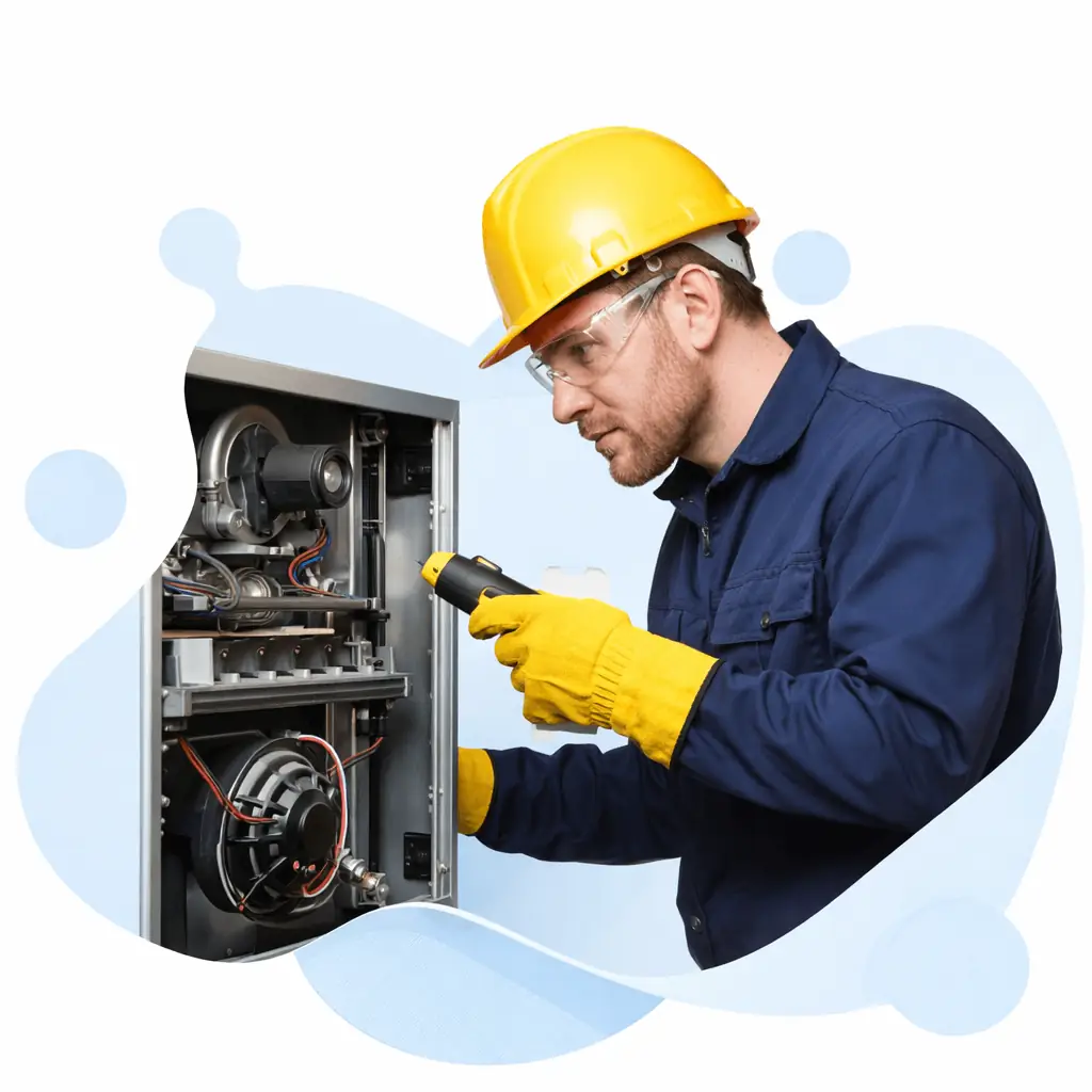 Professional G3 Gas Technician with fair skin inspecting a residential furnace system, wearing safety gear, clean white/light gradient background, 500x500px, high-quality studio portrait.
