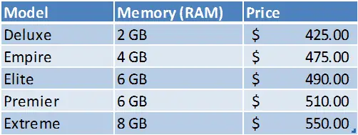 The table shows computer prices at a local electronics store. Use the table to answer the question. April selected the least expensive computer she could buy with 6 GB of RAM memory. She also used a $30 off coupon. How much did she pay for the computer?